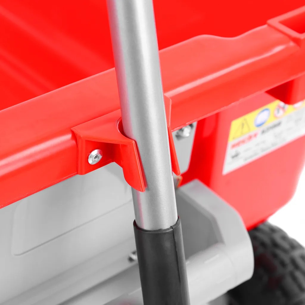 Der Transportkarren ist kippbar. Mit wenigen Handgriffen wird der Handwagen zum Anhänger für Rasentraktoren. Ein Ankuppeln ist an den meisten Rasentraktoren möglich.